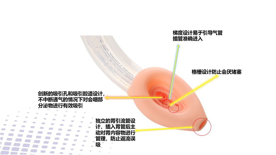 双重防误吸喉罩是新一代升级产品。食道引流通道和气道引流腔被添加到气道通道中。食管引流管可插入胃管以控制食管分泌物。毛孔可有效吸引咽部分泌物,而不会影响通气。